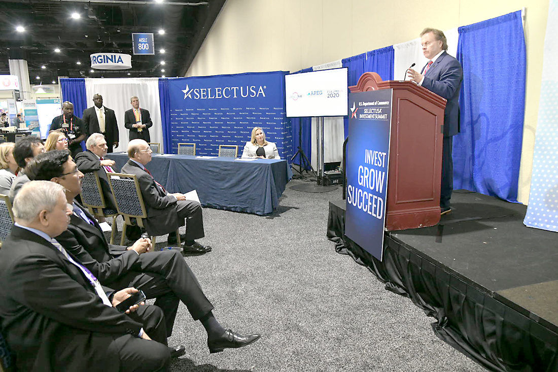 ANNOUNCEMENT — John Hritz, president and CEO of JSW Steel USA, made a statement at the SelectUSA investment summit Thursday at the Gaylord International Resort in National Harbor, Md. Hritz said the investment the steelmaker is making in the Mingo Junction steelworks is planned to be as much as $500 million and is part of a $1 billion investment in facilities in Mingo Junction and Texas. He called the investment “ridiculously exciting” for Mingo Junction. Looking on from the front row is Wilbur Ross, U.S. Secretary of Commerce. -- Contributed/SelectUSA