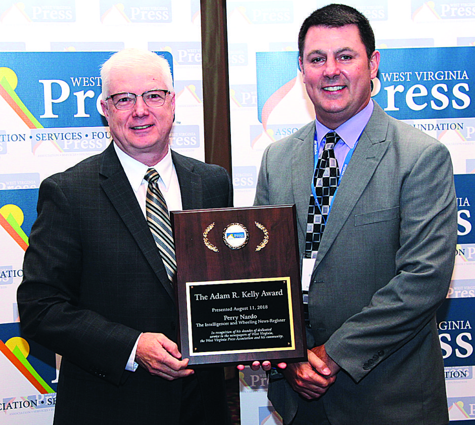 AWARD WINNER — Perry Nardo, publisher of Wheeling News-Register and The Intelligencer, won the West Virginia Press Assocation’s highest honor — the Adam R. Kelly Award — for his outstanding dedication to the newspaper industry, the West Virginia Press Association and his local community. WVPA President Jim Spanner, right, presented the award.