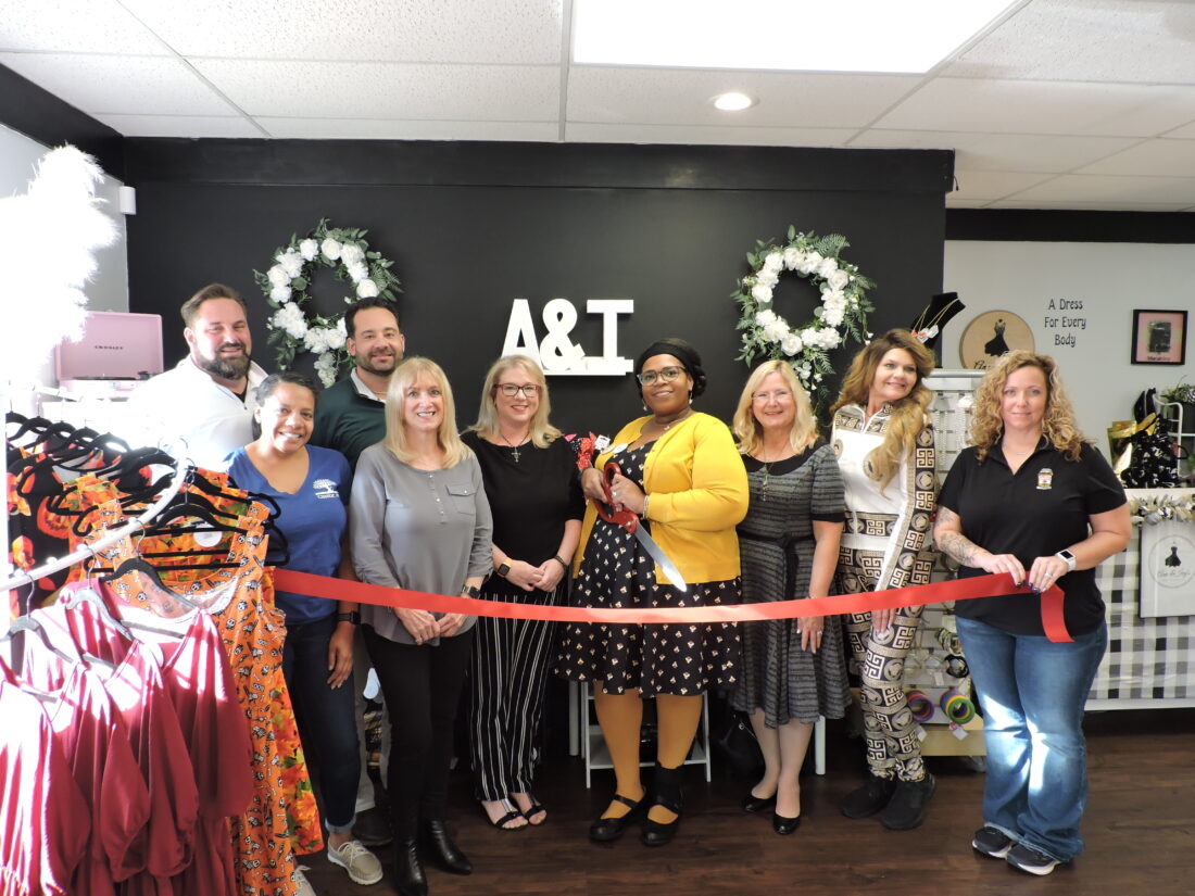 Representatives of the Weirton Area Chamber of Commerce joined Tammy Michael, owner of Ann & Ivy Modern Vintage Boutique, on Oct. 6 to celebrating the store’s one-year anniversary and the grand re-opening at its new location of 3205 Pennsylvania Ave., Suite E, in Weirton. The boutique offers a variety of dresses and other goods, both in store and online. (Photo by Craig Howell)