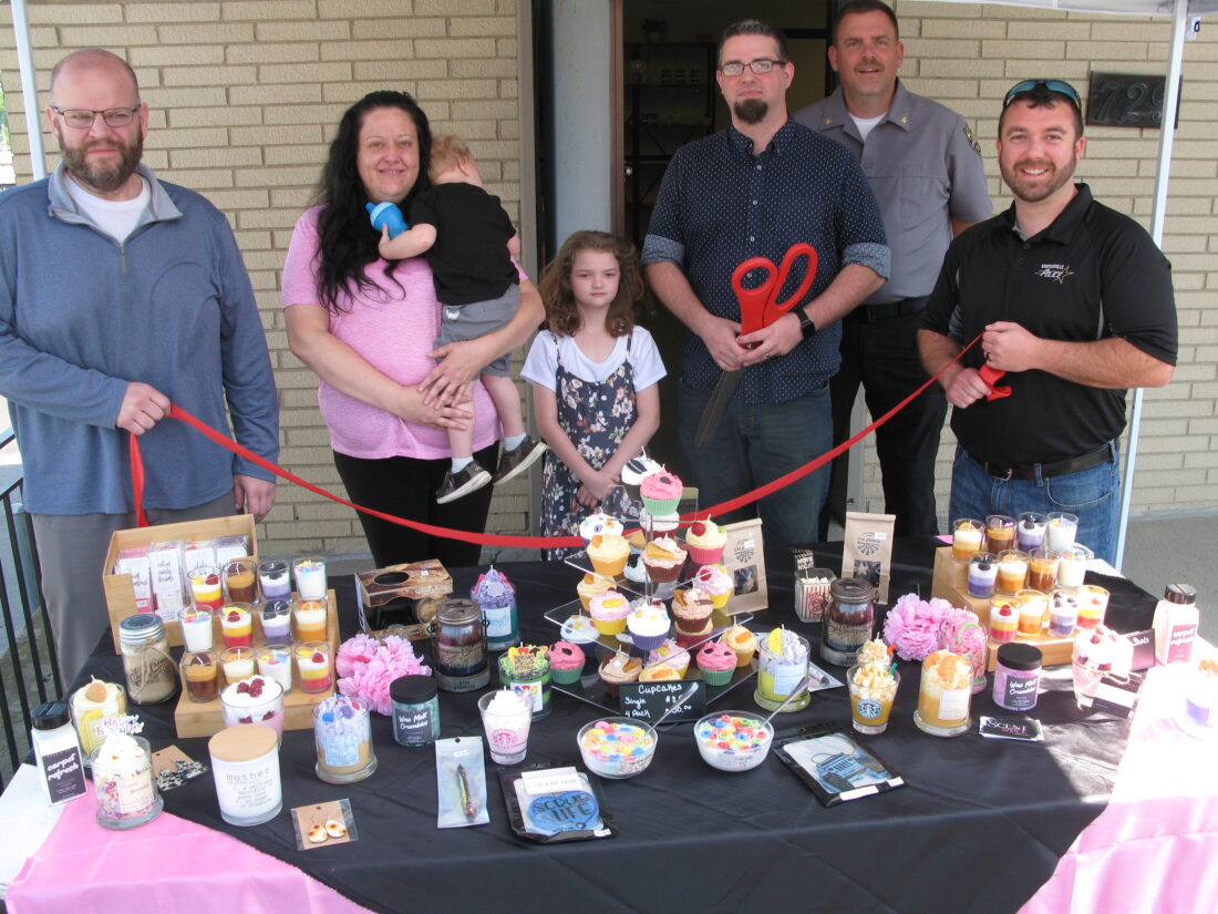TWO IN ONE — Wintersville officials welcomed two new businesses operated by Tim and Kristen Beiber and located at 729 Main St.: the Scent Shack, which offers an assortment of scented candles; and Timages Photography, which offers photography and video production for private or commercial purposes. On hand for the special occasion were, from left, Village Administrator Jessie Kosegi; Kristen, with their son, Braydn and daughter, Shannon, and Tim; Village Police Chief Lou Vandeborne; and Mayor Mike Petrella. (Photo by Warren Scott)