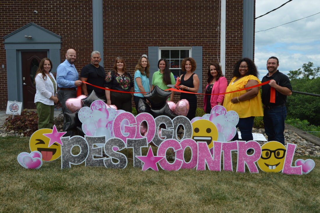 Christopher Dacanay NEW ARRIVAL — Wintersville officials welcomed the owner and staff of Go Go Pest Control LLC, a new business offering insect extermination and wildlife removal, at a ribbon cutting ceremony. On hand for the special occasion were from left, Lisa Neely, human resources director; Village Administrator Jesse Kosegi, Councilman Randy Spence; Maria Tipton, receivables and collections clerk; Becky Cunningham, vice president of accounting; Chrissie Yohman, general manager; Tiffany Luckino, owner; Cindy Cozza, director of operations; Erica Johnson, marketing and media; and Mayor Mike Petrella.