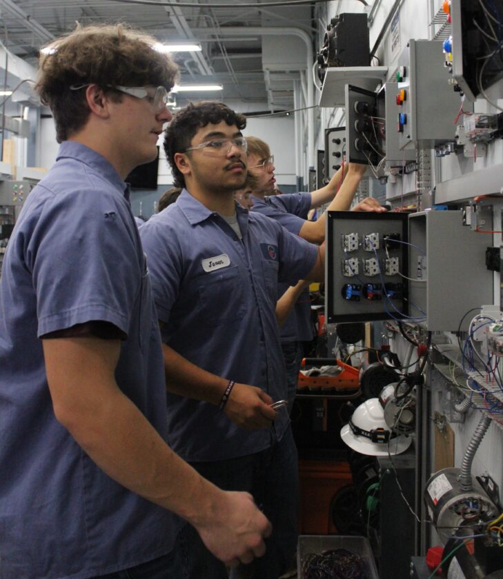Seniors Ryan Mort, left, and Jeven Velez work on motor control and relays in the electrical trades program at Jefferson County Joint Vocational School as they hone their knowledge in the field. The program gives students hands-on experience and helps them learn practical skills related to electrical work, including wiring, circuit design, installation, maintenance and repair. (Contributed photo)