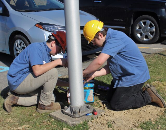 The electrical trades and heavy equipment operator programs teamed up at Jefferson County Joint Vocational School to wire the flagpole for lighting and networking for cameras on the exterior of the building. Students put the skills they learned in class to use while the HEO pupils also had a ...