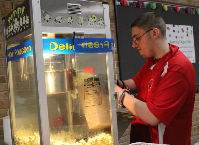 Ray Cooper, a Transition to Work student at Jefferson County Joint Vocational School, prepares bags of popcorn for sale for TTW’s Soaring Eagle school store. He and his classmates also sell freshly made cookies and slushies during lunchtime in the commons area and learn management and other ...
