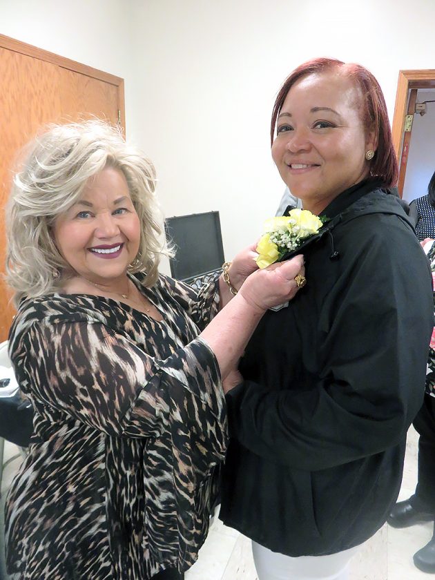 True to tradition, the Steubenville Kiwanis Club held its administrative assistants celebration during its noon luncheon meeting on Tuesday at the YWCA of Steubenville. Chaired by member Phyllis Riccadonna, the observance offers administrative assistant staff members from the workplaces of Kiwanis members a luncheon and corsages in a show of appreciation for all that they do. Riccadonna, left, pins a corsage on one of the attendees, April Minniefield, secretary in the main office at Steubenville High School and a guest of Principal Ted Gorman. The annual observance was started by the late William Croskey.