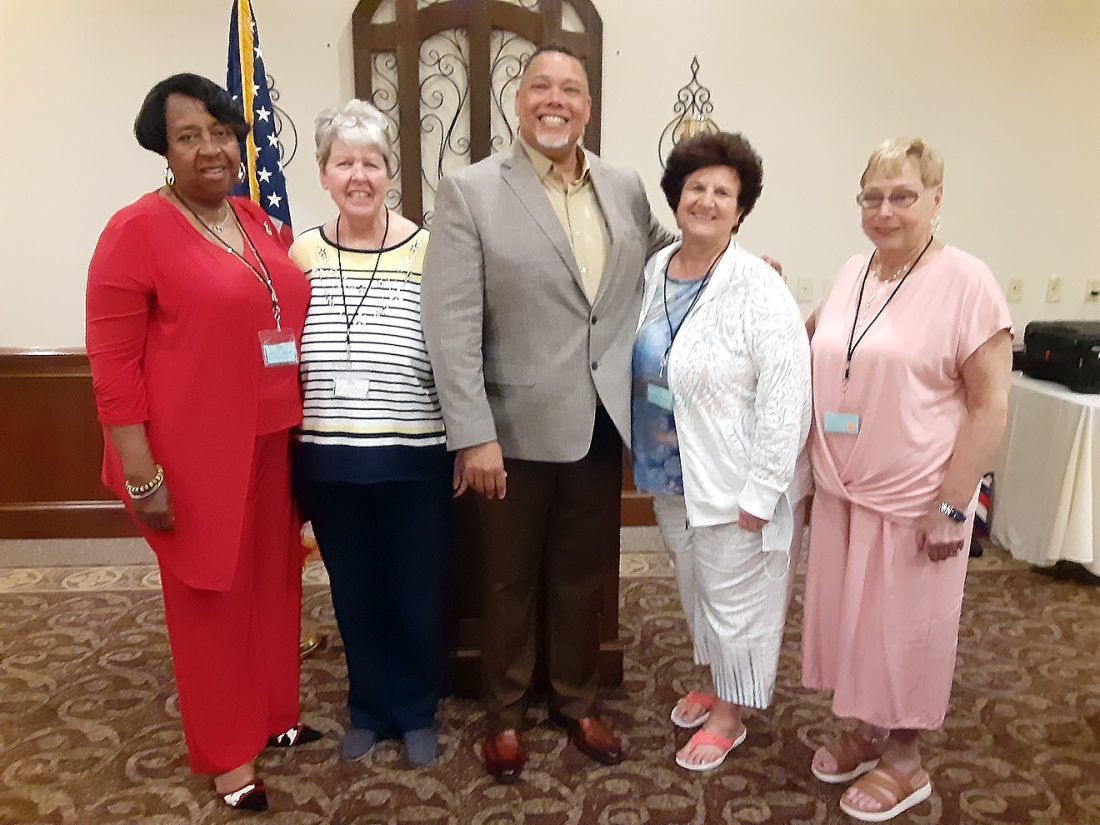 The Federated Democratic Women of Ohio held its 89th spring convention and election of officers in Hartville on June 5, with two Jefferson County women holding posts. From left are, President-elect Edna Borders, Summit County; Eileen Krupinski, trustee, Jefferson County; guest speaker Andre Washington, vice chairman of the Ohio Democratic Party; Kathy Antinone, Jefferson County, regional vice president, Region 8; and Norma Welling, Portage County, immediate past president.