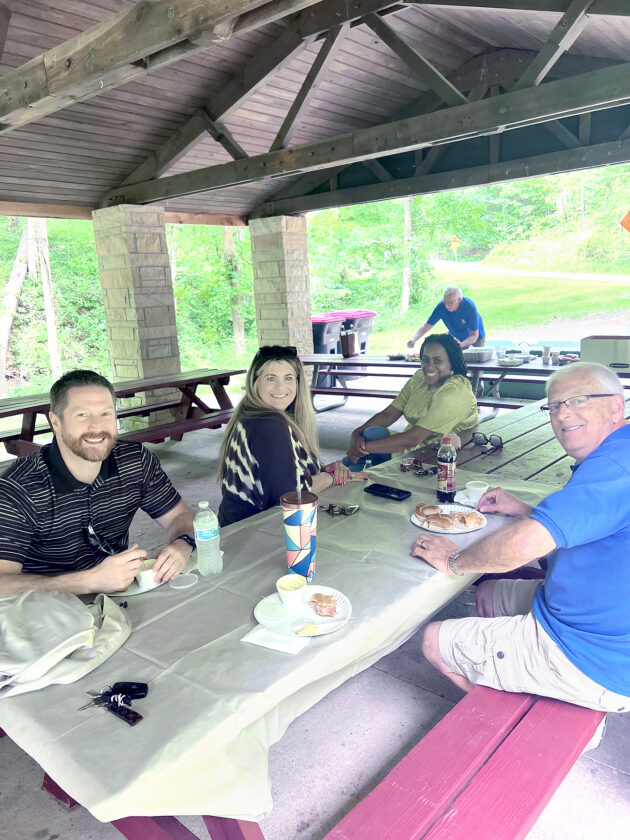Gary Wickham, Jill Wickham, Marlies Brandt, Mary Alice Brandt, Andrea Taylor and Kris Haught eat in Beatty Park.