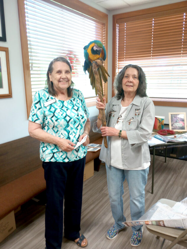 DAR MEETS VITO — Members of the Fort Steuben Chapter of the National Society of the Daughters of the American Revolution received a special visitor during their May 13 meeting. Regent Mary Ann Jesse, left, welcomed the meeting’s guest speaker, Jeanne Czernek and her parrot, Vito. -- Contributed