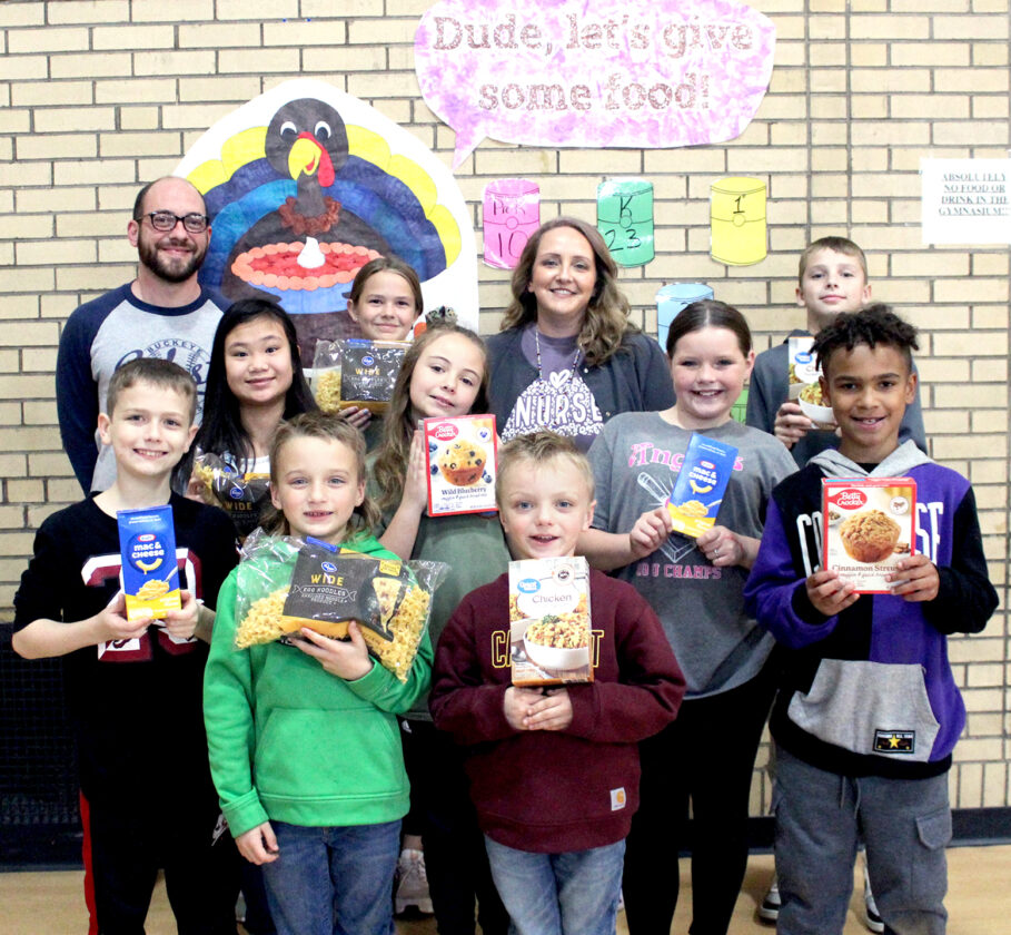 Preschoolers were responsible for bringing canned fruit; kindergarten pupils collected muffin mix and cornbread mix; first-graders were in charge of gravy packets; second-graders, noodles; third-graders, cranberry sauce; fourth-graders, stuffing; fifth-graders, macaroni and cheese; and sixth-graders, overseeing boxed desserts, canned pie filling and boxed pie crusts.