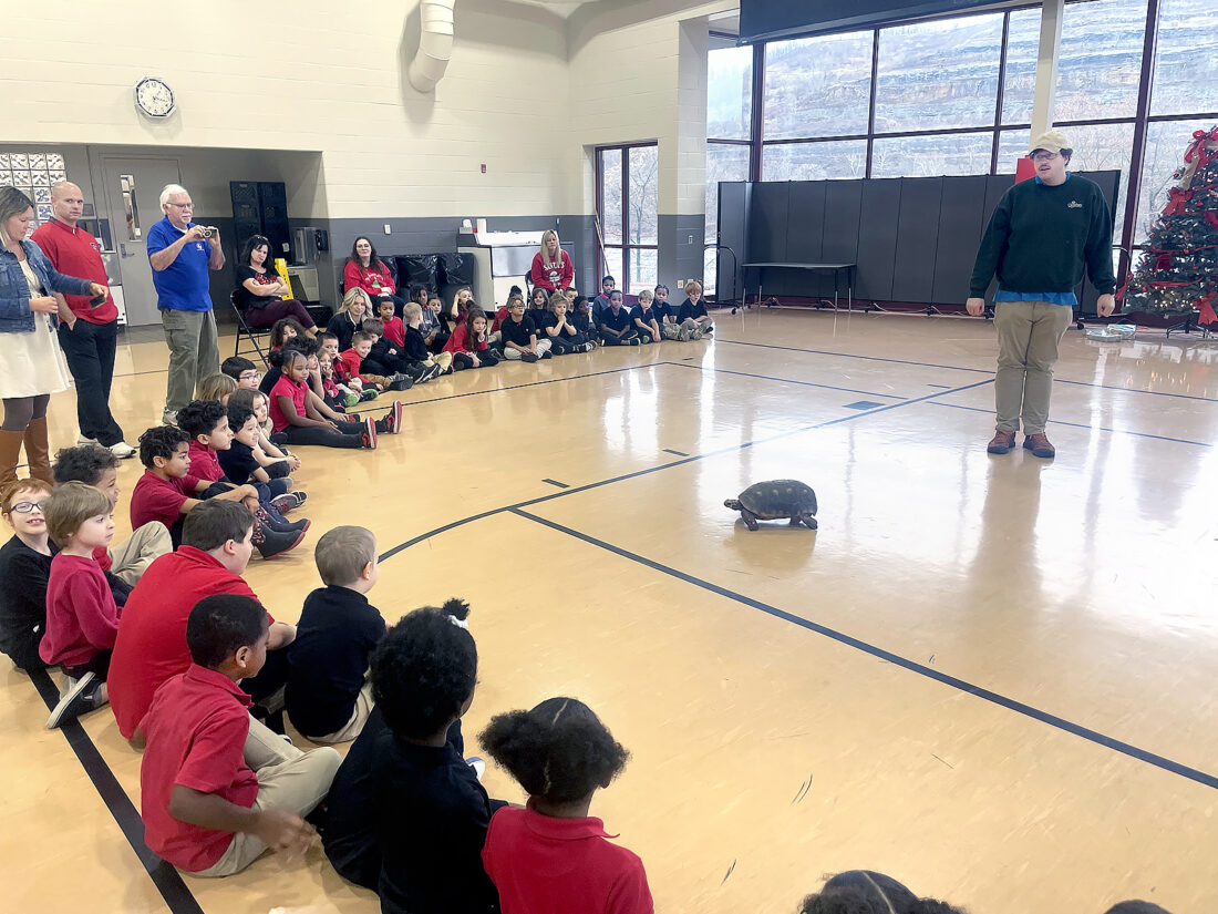 KIWANIS WISHES PUPILS MERRY CHRISTMAS — Members of the Steubenville Kiwanis Club, along with students in the Steubenville High School Key Club, met at East Garfield Elementary School Monday for a special celebration. First-grade pupils received an early Christmas surprise as the Oglebay Good Zoo paid a visit to the school and T-shirts and other school supplies were distributed by the Kiwanis Club. Those attending the event, at top, were, from left, front, Norah Younce and Isabella Cadile; and back, Tom Timmons, Julia Gentile, Natalie Romanyak, Gabriella Vein, Emily Byers, Kiwanis President Laura Rauch and Paul Brandt. Below, Decklyn Scott, education curator for the Good Zoo, brought along Garnet, a 40-year-old tortoise. He also brought a corn snake and opossum to show. -- Julie Stenger
