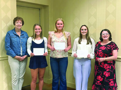 Scholarship Chairman Cathy Glass presented scholarships to Oak Glen students Kensington McConnachie and Georgia Wooley, and to Leanna Bissett from Weir High School. Each recipient plans to study education as their college career.