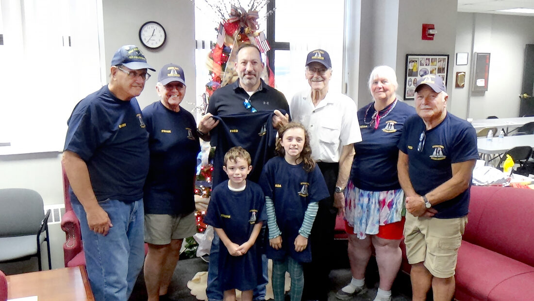 Jefferson County Sheriff Fred Abdalla Jr. hosted his bi-monthly veterans gathering on Tuesday. Abdalla held a barbecued luncheon for area veterans at the Jefferson County Sheriff’s Department, where approximately 40 veterans enjoyed an array of picnic foods, along with desserts. Barry Bardone, adjutant for the Jefferson County Veterans Association, presented Abdalla with the organization’s new symbolic T-shirt for his continuous support of the JCVA and all veterans. Those attending the barbecue luncheon included, from left, front, Joseph and Giada Maccariella, JCVA supporters; and back, Bardone; Frank Santa, JCVA member; Abdalla; John Kaffana, JCVA commander; Michelle Hedgecoke and Fred Tarr, JCVA members. Bardone advised those in attendance of the JCVA’s upcoming county-wide picnic for all veterans and those who are currently serving in the military. The free event will take place July 26 at the Shelters 1,2 and 3 at Friendship Park in Smithfield.