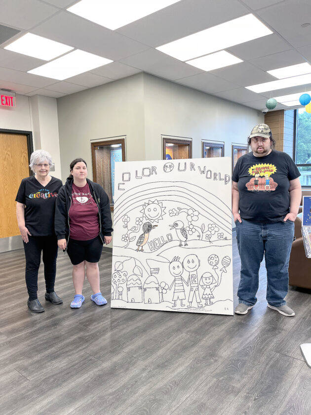 TRAVELING CANVAS — A traveling canvas entitled “Color Our World” will stop throughout Jefferson County so local residents of all ages and all abilities can add their touch of color to the artwork. The project is being collaborated by the Jefferson County Board of Developmental Disabilities, the Public Library of Steubenville and Jefferson County and the Steubenville Art Association. The canvas, which was designed by members of the SAA and JCBDD, will be on display June 9 through July 17 at the following library branches: Steubenville, Brilliant, Tiltonsville, Dillonvale-Mount Pleasant, Adena and Toronto. The activity coincides with the library’s Summer Reading Program. Information is available online at steubenvillelibrary.org. Those who helped create the art on the life-size canvas included, from left, Judy Schmidt, president of the SAA; Danielle Tressler and Richie Maytas, artists from the JCBDD. -- Contributed