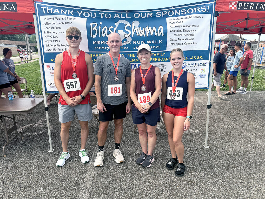 The Biasi-Shuma Memorial 5K Run was held July 5 through Toronto, with participants raising $22,000 for local cancer patients, the United Way of Jefferson County and a scholarship for a Toronto High School graduate. The top finishers in each category included, from left: Austen Duggan, first place, male runners, with a time of 16:31; Christopher Fox, first place, male walkers, with a time of 30:45; Lisa Hensley, first place, female walkers, with a time of 36:13; and Madison Conrad, first place, female runners, with a time of 20 minutes.