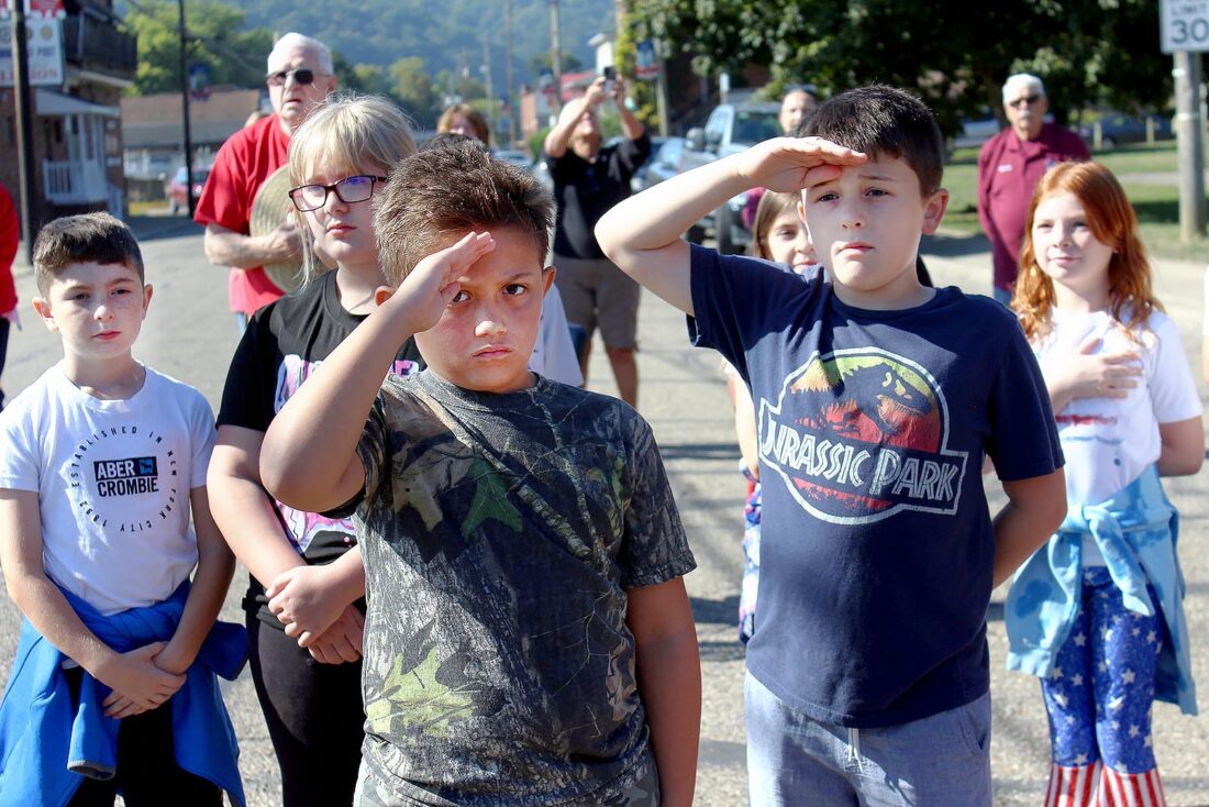 REMEMBERING IN BRILLIANT — Fourth graders at Buckeye North Elementary School saluted, placed their hands over their hearts and remained silent during a rendition of taps played during the Brilliant American Legion’s annual Sept. 11 ceremony. Students taking part in the ceremony included, from left, front, Jackson Hilliard and Jackson Chesonis-Spano; and back, Mayson Maderia, Londyn Sterling, Laney Maderia and Rylee Wilson. -- Contributed