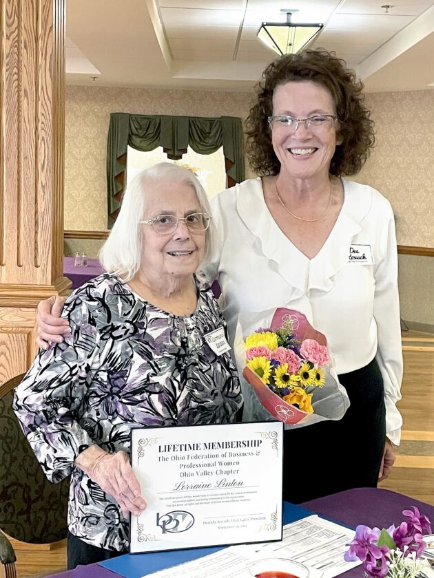 - LIFETIME ACHIEVEMENT — Ohio Valley BPW member Lorraine Linton, left, received a lifetime achievement certificate from President Dee Kovach during the group’s Sept. 16 meeting. Linton has been with BPW since 1991. — Contributed