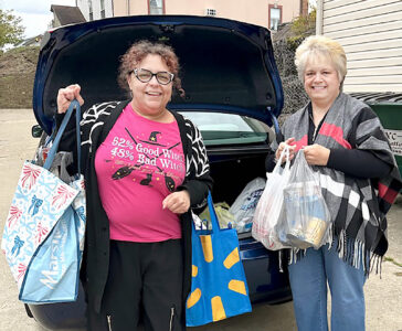 HCARSE GIVES TO NONPROFIT — Members of the Hancock County Association of Retired School Employees donated non-perishable food items to the Community Bread Basket in Weirton as part of its outreach project for October. Taking part in the distribution were, Cherie Odell, left, administrative assistant for the CBB; and HCARSE President Melanie Donofe, who transported the donations and was pleased with the group’s contributions to the nonprofit.