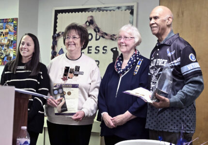 - HONORING VETERAN — The Fort Steuben Chapter of DAR met for its November meeting, naming Bob Kelley the chapter’s Veteran of the Month. Kelley presented Shana Wydra and Karen Blanc with a pin, as wives of living veterans. Taking part in the ceremony were, from left, Wydra, Blanc, Regent Janet Rymer and Kelley. — Contributed
