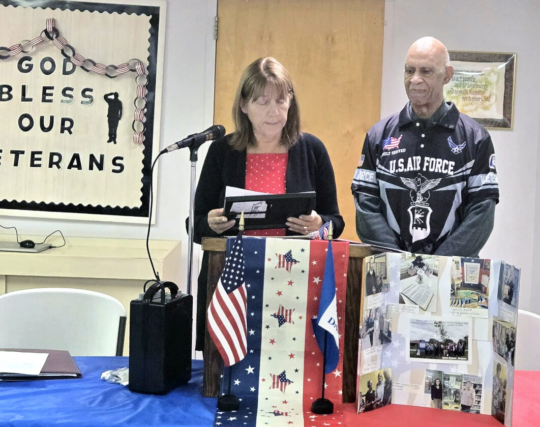 - HONORING VETERAN –– Kelley was introduced to the chapter by Susan Welch, chairman of the DAR Service for Veterans Committee. — Contributed