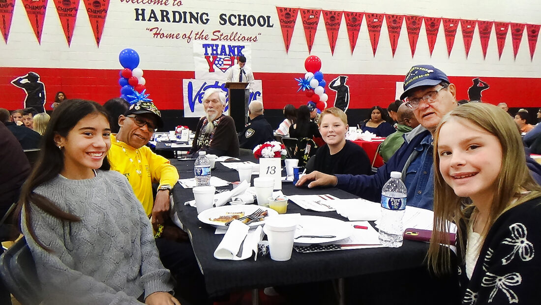Harding Middle School students involved in the Leo Club hosted the school’s sixth-annual veterans breakfast, which honors local veterans on Veterans Day. A program held during the meal included the Jazz Choir singing the national anthem and a rendition of taps offered by Rick Hicks. Members of each military branch were represented and invited to stand during the playing of their respective service anthems. A solemn table known as America’s White Table, was recognized by those in attendance. The table is set within military dining halls and at official functions which honor prisoners of war and those missing in action. Students in the Leo Club were assigned to a veteran, acting as their guide and server throughout the morning. Veterans participating in the breakfast included, alongside their student representative, from left, Jeffrey L. Hawkins, Navy veteran, 1969-71; Ron Hastwell, Air Force veteran, 1966-70; and Barry Bardone, Air Force veteran, 1965-69.