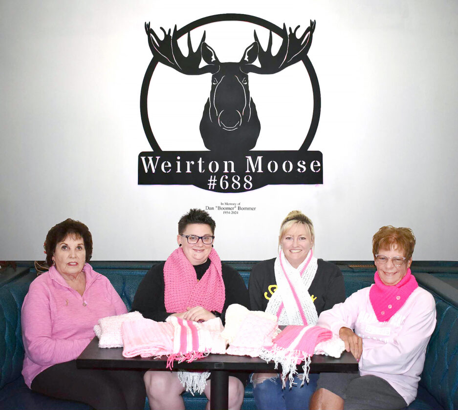 Weirton Moose Lodge 688 and the West Virginia University Medical Center focused on breast cancer awareness throughout the month of October. In an effort to become more involved with the community, those with the lodge and Administrator Rich Finley presented the medical center with scarves. The scarves were made with love and represent the caring its members have for community members fighting breast cancer, officials explained. Taking part in the event were, from left, Moose members Signa Finley, Alana McKitrick, Julie Dennis and Dawn Ohalek. The lodge is next looking to hand-craft lap blankets for patients when they must undergo chemotherapy treatments.