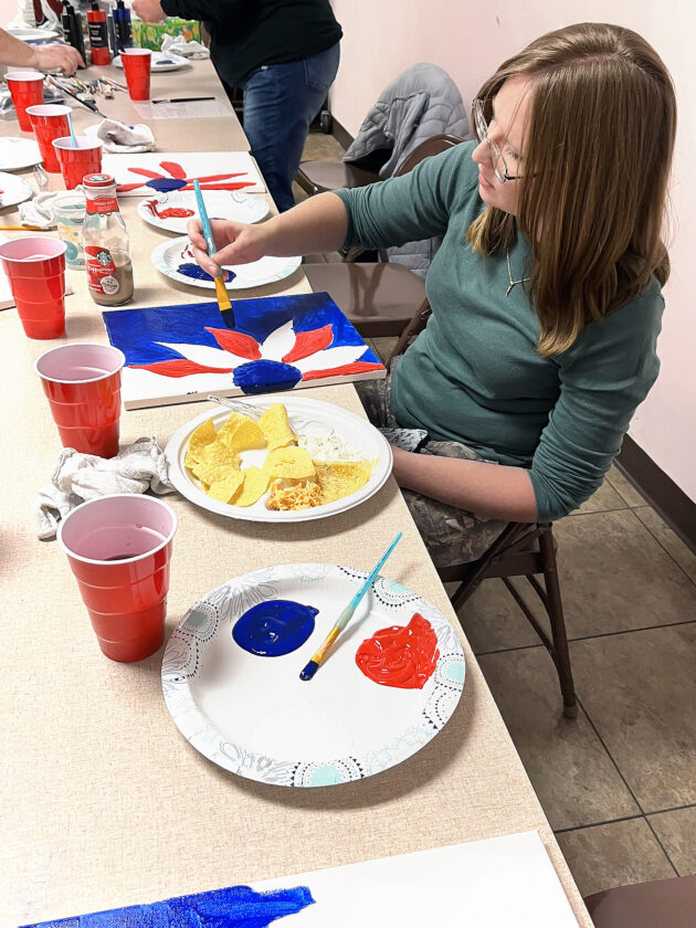 Members enjoyed a Paint and Dip activity, creating patriotic paintings in honor of Veterans Day, led by Martindill. Hostesses Tammy Fields, Susan Gracie and Rita Schmitt provided various chips and dips for refreshments.