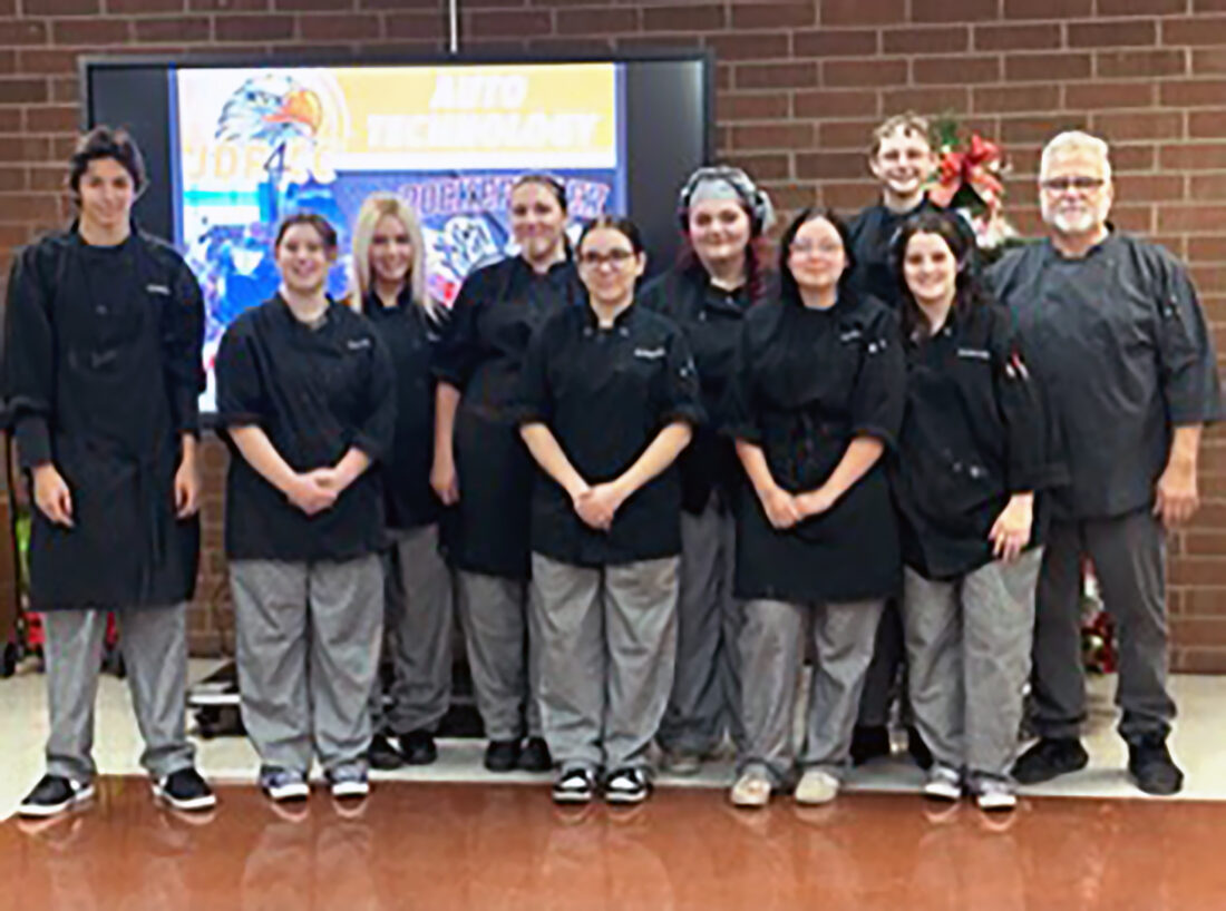ProStart Culinary students from Weir and Oak Glen high schools prepared lunch for members of the Hancock County Association of Retired School Employees. Students helping to prepare the meal included, from left, Jayden Grace, Evelyn Bellville, Rilee Carroll, Natalee Clifton, Angel Zajde, Alexis Berdine, Isabelle Leasure, Luca Bongiovanni, Kayle Little and Chef Steven “Bo” Fuscardo. Kylie Dunmyer assisted in the preparation as well.