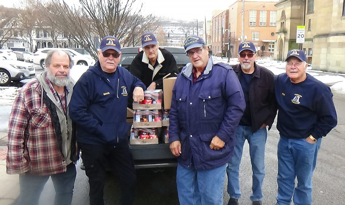 The Jefferson County Veterans Association made a donation of 100 boxes of pasta and 60 jars of sauce to the Friendship Room in Steubenville on Wednesday. The donation, secured by JCVA Cmdr. Frank Santa, was accepted by Friendship Room Coordinator Liam McGovern. Those on hand for the presentation included, from left, Roger Sibson, Friendship Room representative; Dave Rhodes, JCVA member; Tony Phillippi, JCVA finance officer; Barry Bardone, JCVA adjutant; Tom Hutkay, JCVA sergeant-at-arms; and Fred Tarr, JCVA vice commander. McGovern posted a thank you to the group on the Friendship Room’s Facebook page, which people can view for updates and the current needs of the organization.