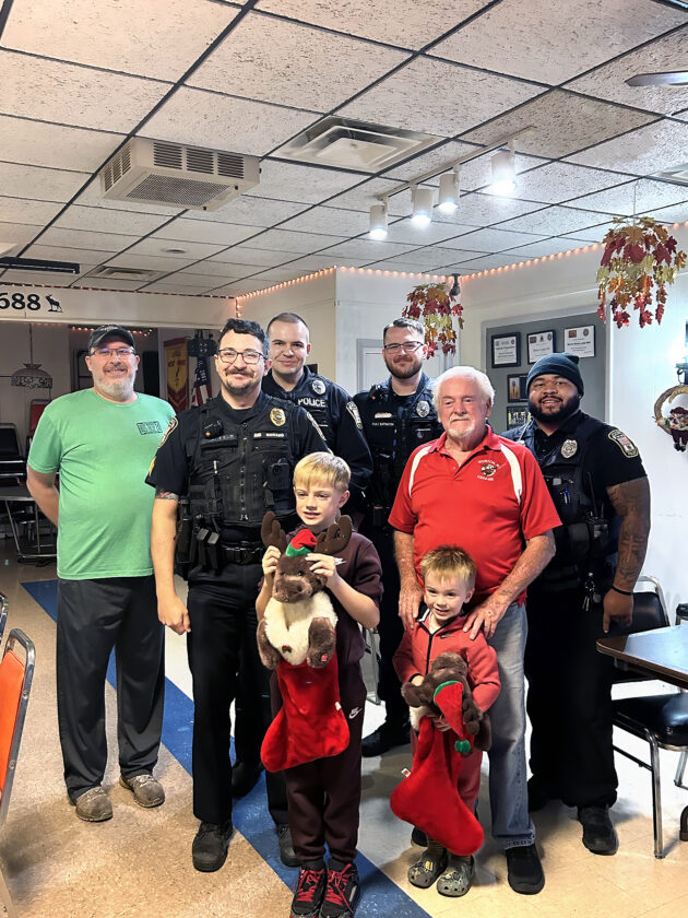 Members of Weirton Moose Lodge 688 held a spaghetti dinner in October to raise proceeds for a Christmas surprise for two of its members. The dinner charged $10 per guest, with first responders invited to attend free of charge. Moose Lodge board member Howard Mellott and his wife, Debbie, organized the event. Administrator Rich Findlay stated he hopes to make this an annual fundraiser. The holiday surprise came during the holiday season, with the members and their grandsons receiving a special visit from Weirton police officers, who attended as guests. Findlay presented the boys with Christmas stockings containing gifts. Joining officers at the party were Findlay and lodge member Scott Douglas.