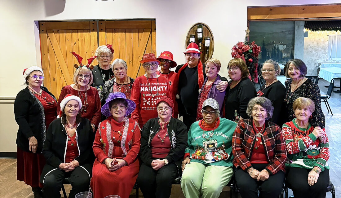 The Red Hats’ La Bonne Vie Chapter held its annual Christmas party Dec. 17 at Scaffidi’s Restaurant and Tavern in Steubenville. Following dinner, members were entertained with a special performance which featured Dave Watkins. Those in attendance included, from left, front, Rose Pulice, Elba Hada, Ruth Morris, Patricia Butler, Lucia Scaffidi and Filomena DiCarlantonio; and back, Ida Provenzano, Vicki Nurczyk, Barbara Riesling, Joanna Magnone, Joyce Parrish, Terry Jennings, entertainers Dave Watkins and Shari Jo Watkins, Cindy Misagione, Kathi Harding and Theresa Lamantia.