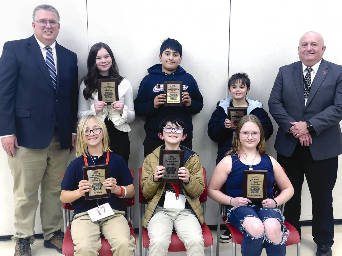 Kaden Haddox, a seventh-grader at Indian Creek Middle School, placed first in the Indian Creek Local School District Spelling Bee, held Jan. 13 at Indian Creek Middle School. Haddox correctly spelled “cadre,” a noun meaning a nucleus or core group, especially of trained personnel able to assume control and to train others, to claim the win. Taking part in the awards ceremony were, from left, front, Haddox; Ben Gorby, a fifth-grader at Indian Creek Middle Schools, second; and Shaylor McHugh, a sixth-grader at Indian Creek Middle School, third; and back, Todd Herman, district spelling bee coordinator; Savannah Brock, a seventh-grader at Jefferson County Christian School, alternate; Shlock Chavda, an eighth-grader at Indian Creek Middle School, fifth; Damien Wright, a fifth-grader at Indian Creek Middle school, fourth; and Superintendent T.C. Chappelear. The top five spellers and alternate will advance to the Jefferson-Harrison County Regional Spelling Bee, presented by the Herald-Star, at 11 a.m. March 14 at Buckeye North Elementary School in Brilliant.