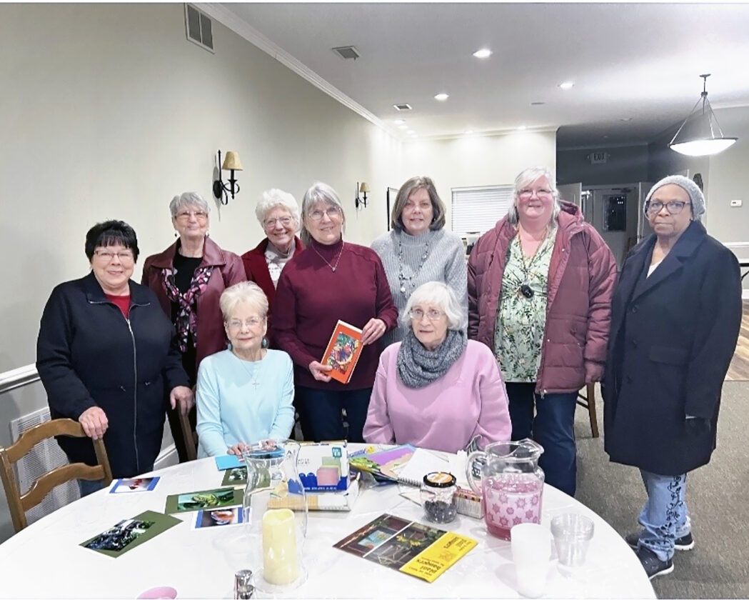 Members of the Woodland Garden Club met to learn about garden therapy, a program presented by Jodi Russell. Russell explained how gardening is possible during the winter months by having those in the club create cards containing pictures of the hobby, which they can then send to friends of all ages, including those who may have mobility issues. Among those in attendance were, from left, front, Joyce Griffin and Sarah Grafton; and back, Susan Tatar, Nancy Hukill, Cherrie Kough, Russell, Carole Patton, Amanda Roach and Norma Harris. Member and photographer Elaine Wukelic took part in the event as well.
