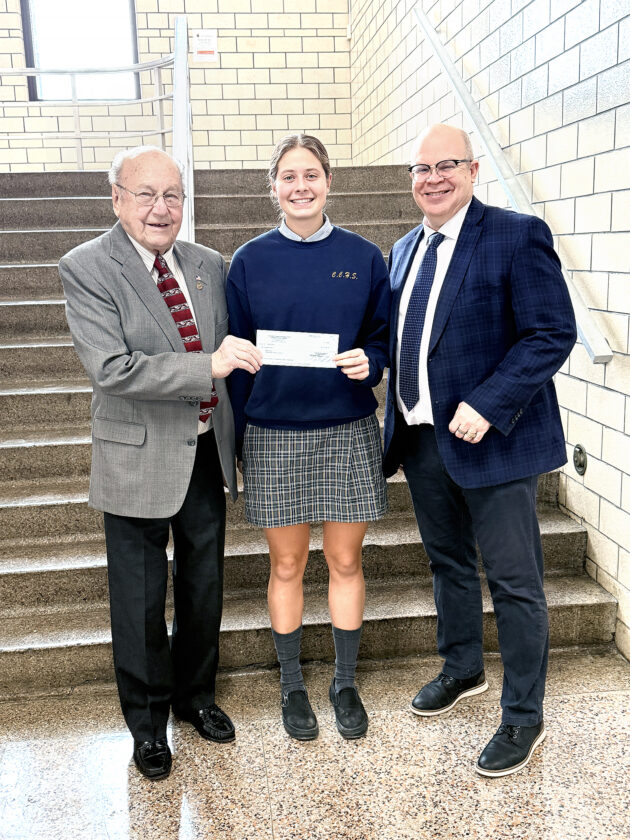 Baci Carpico, left, past state deputy of the Ohio Knights of Columbus and current member of the Ohio Charity Foundation, presented a $1,000 check to Mary Rohde, a senior at Catholic Central High School. Principal Todd Phillipson was in attendance during the presentation, recognizing Rohde as she demonstrated outstanding involvement in school and community activities, as well in academic excellence. Scholarship applicants are for students in ninth through 12 grades and who attend a Catholic high school within Ohio. Consideration is given based on a student’s financial need, academic awards, community or parish involvement and extracurricular activities. During this school year, the Knights of Columbus has presented 25 scholarships totaling $25,000. Since the inception of the scholarship program in 1997, the Knights have provided more than $900,000 to outstanding students in Catholic high schools throughout Ohio.