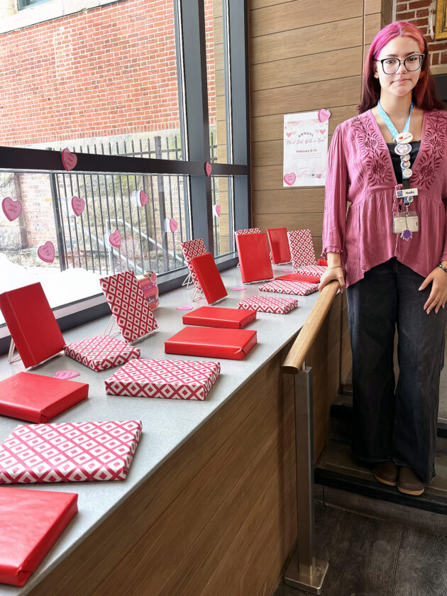 BLIND DATE — Nadia Kizito, library assistant at the Main Library of the Public Library of Steubenville and Jefferson County, displayed the covered books used in the Blind Date with a Book event, taking place now through Saturday in recognition of Valentine’s Day. -- Contributed