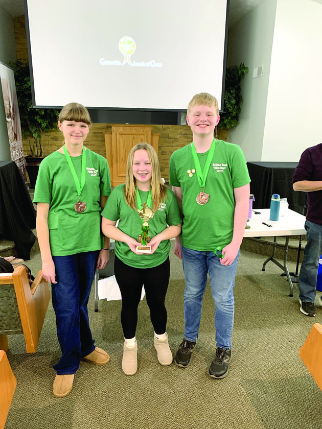Photo provided Youth members of the National Road Church of Christ, from left, Julia Cronin, Lydia Cole, Micah Parsons participate in last year’s Miami Valley Bible Bowl in Centerville, Ohio. This year’s event is being hosted at the National Road Church of Christ in Wheeling this weekend.