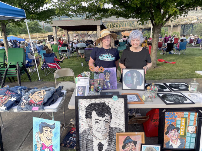 During the 29th-annual Dean Martin Hometown Festival, members of the Steubenville Art Association set up a display table filled with an assortment of Martin merchandise for sale. SAA member Sara Cunningham, left, along with President Judy Schmidt showed off the homemade items they, and other ...