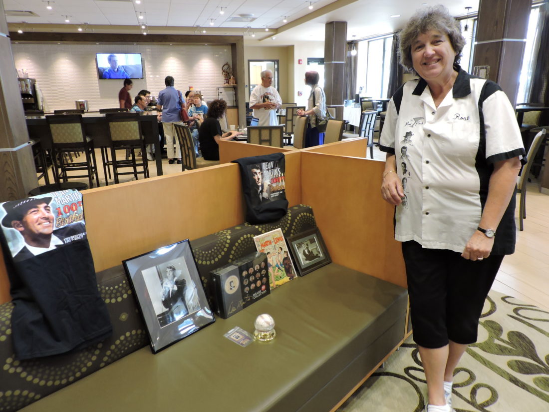 Rose Angelica, chairwoman of the Dean Martin Festival Committee, stands next to several of the items that will be featured at the Dean Martin silent auction planned from 5 p.m. to 7 p.m. Friday at the Inn at Franciscan Square on University Boulevard. Angelica said this will be her last Dean Martin Festival. — Dave Gossett