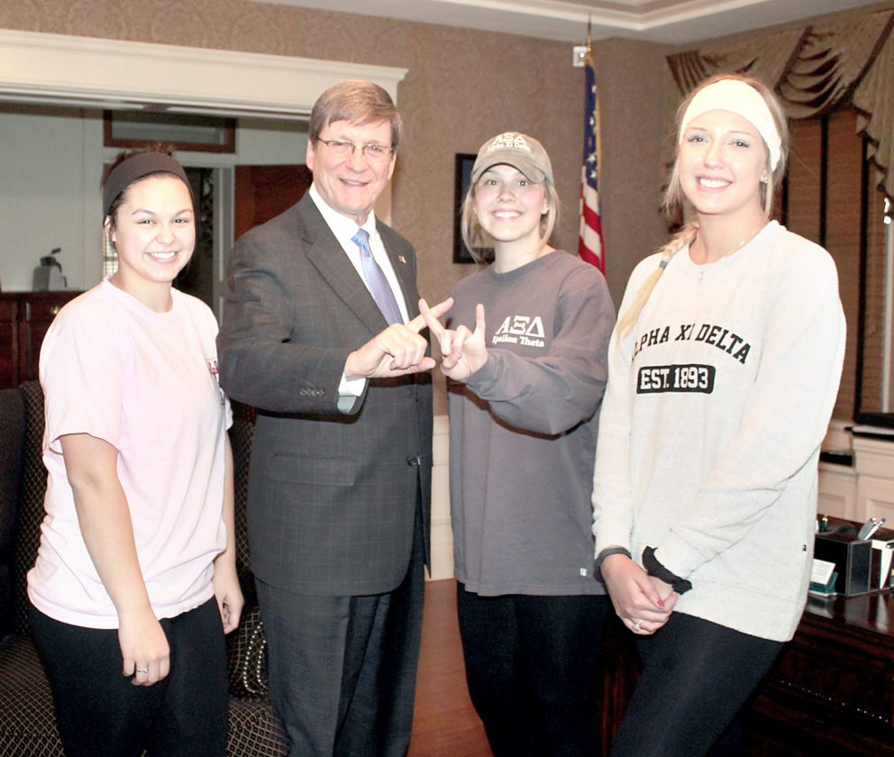LIGHT UP BLUE — The Alpha Xi Delta sorority at West Liberty University held a Light Up Blue night Tuesday in support of Autism Speaks, the national autism awareness organization. Taking part were, from left, Taylor Curry, university President Stephen Greiner, Megan Lees and Fallyn Yonish.