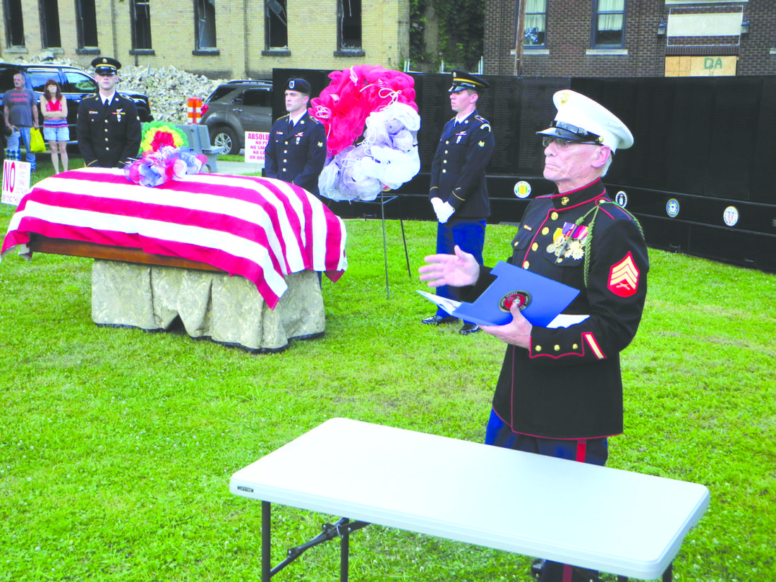 WALL IN WELLSBURG— Jack Ernest, a Wellsburg native and Vietnam War veteran, reflected on the patriotism and sacrifices of those who served in the war during a service held by the West Virginia Vietnam Mobile Wall at Wellsburg’s Central Park Monday. Similar in appearance to the Vietnam Veterans Memorial in Washington, D.C., the wall bears the names of 787 West Virginians who were killed in action, missing in action or prisoners of war while serving in Vietnam. A casket was placed before the wall to represent the many who died for their country. The mobile monument will remain at the park until 8 p.m. today. -- Warren Scott
