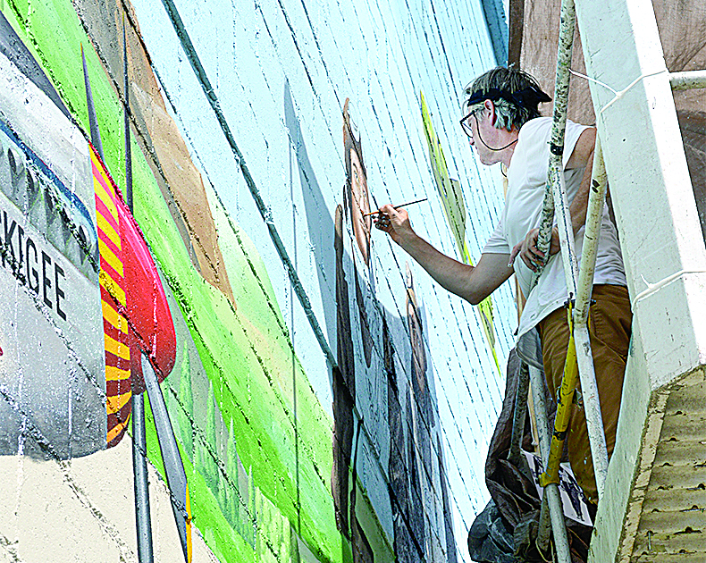 DETAILS, DETAILS — Artist Ruston Baker adds detail earlier this month to his Tuskegee Airmen mural, which features Steubenville brothers Jerome and John “Ellis” Edwards and eight planes. The work of art is set to be dedicated during a special ceremony Sunday on Washington Street. -- Linda Harris