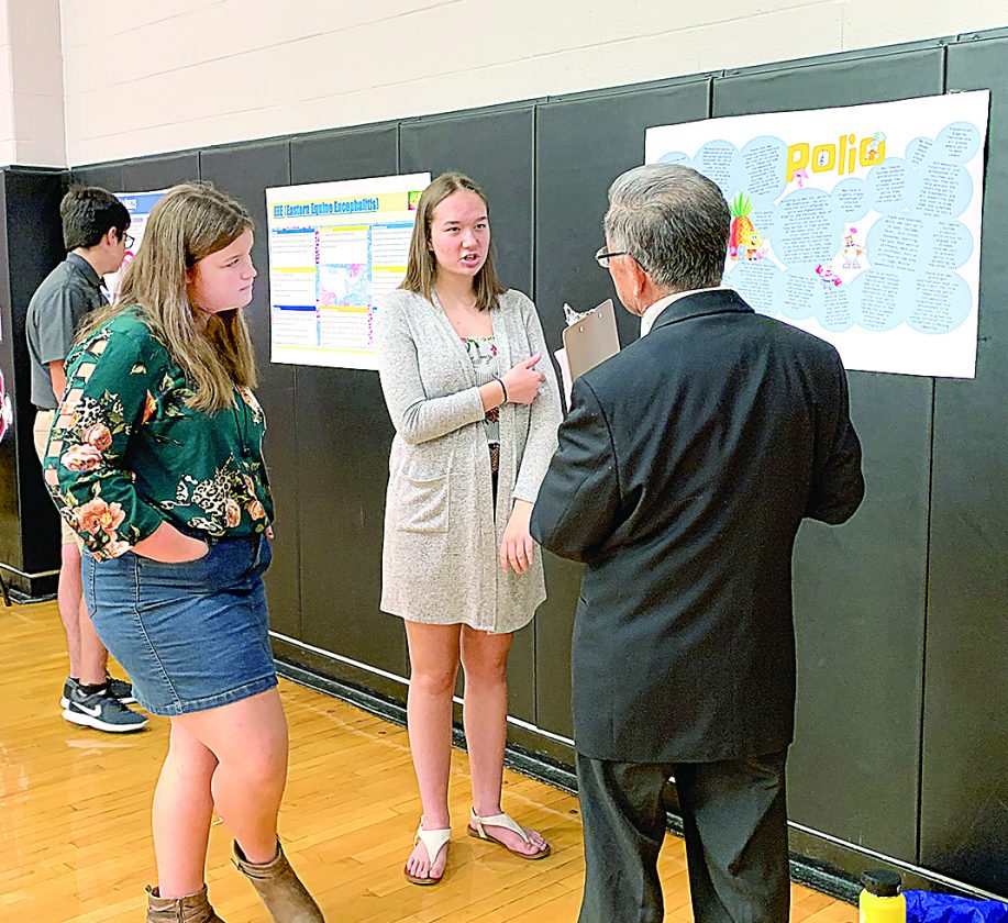 UNDER THE MICROSCOPE — Corryn Lahr, left, and Lila Nemeth discuss developments in polio with Dr. Santiago Ching, sponsor of the Ching Family Health Science Fair at Steubenville High School Wednesday.
