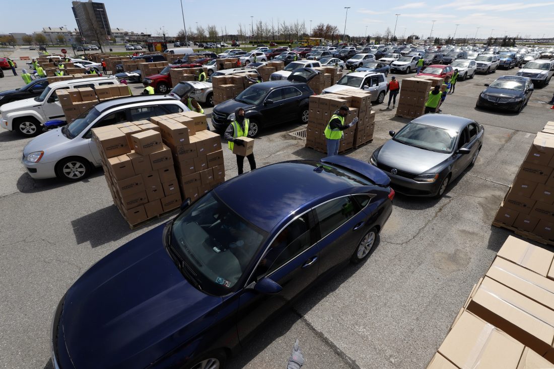 HELPING -- volunteers from the Greater Pittsburgh Community Food Bank loaded boxes of food into cars during a drive-up food distribution Wednesday in the parking lot of Pittsburgh International Airport. -- Associated Press
