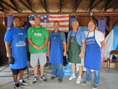 - In this photo, helping to cook hot dogs at the Democratic building were, from left, Edward Littlejohn, candidate for county commissioner; Darrin Corrigan, candidate for clerk of courts; Michael Fletcher, candidate for state senate; Bob Smith, candidate for county commissioner; and Richard Olivito, candidate for state representative. Candace DeStefano was in charge of the party’s bake sale.