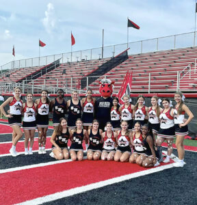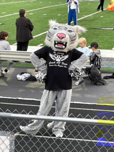 “What I like most is a tie between Friday night football games and competing in cheer competitions with the cheerleaders. They’re both so much fun,” she said, identifying her least favorite part being the heat the suit can generate. “It can be pretty unbearable, especially at the beginning of football season.”