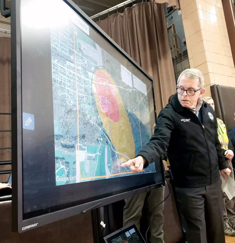 CONCERNS — Ohio Governor Mike DeWine points to a map showing the areas of East Palestine and Pennsylvania where residents were forced to evacuate due to risk of explosion from several of the derailed train cars. - Kristi R. Garabrandt