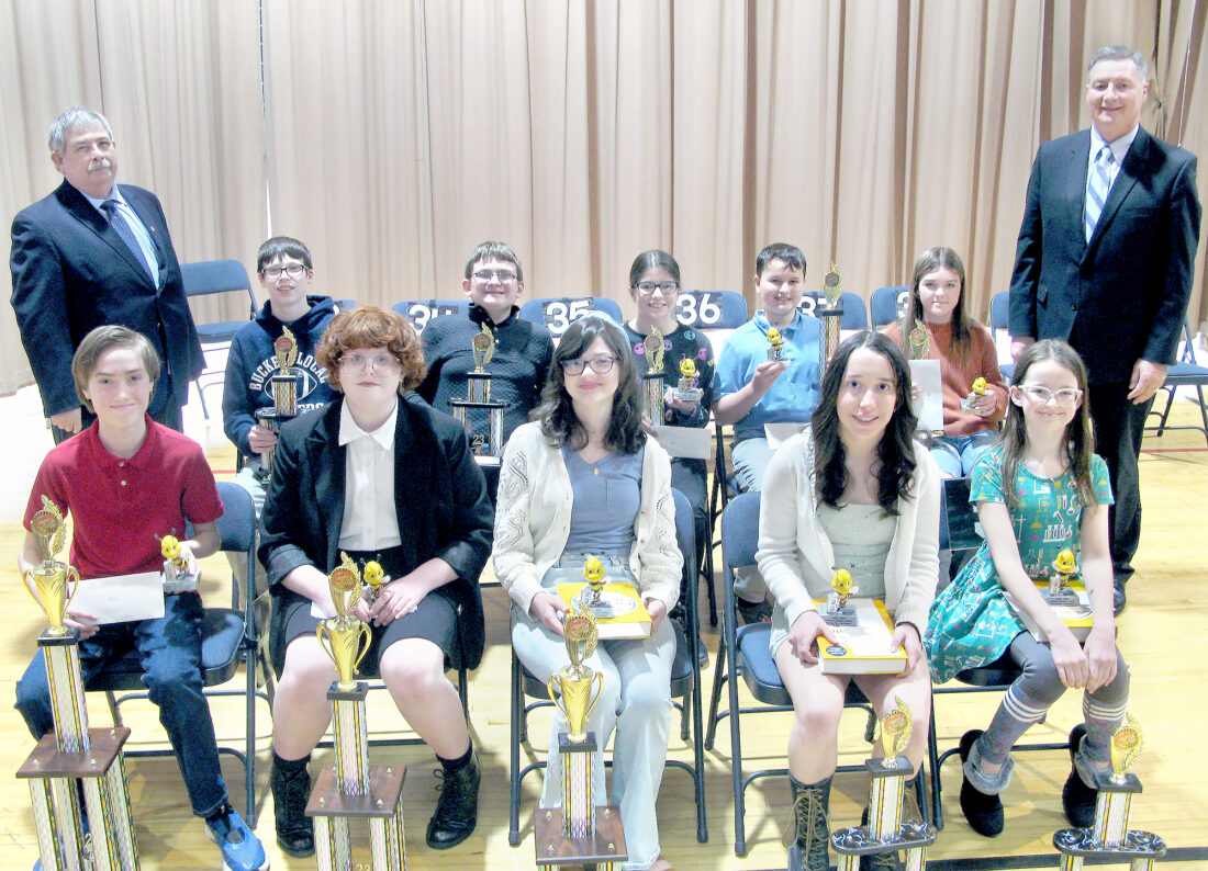 TOP SPELLERS — Andrew Macdonald, an eighth-grader at Bishop John King Mussio Junior High School, emerged the winner of the 39th-annual Jefferson-Harrison County Regional Spelling Bee Presented by the Herald-Star Saturday at Buckeye North Elementary School. Macdonald also won last year’s bee and will again compete in the Scripps National Spelling Bee in Washington in May. With Macdonald, at the far left in front, for a presentation of awards to the 10 finalists are, from left, front: Erin Joyce, a sixth grader at Bishop John King Mussio Elementary School, second place; Ava Mizak, a seventh-grader at Bishop John King Mussio Junior High School, third place; Jocelyn Saltsman, an eighth-grader at Jefferson County Christian School; fourth place; Susie Safranski, a sixth-grader at Bishop John King Mussio Elementary School, fifth place; and back: Ross Gallabrese, executive editor of the Herald-Star and The Weirton Daily Times; Jonas Eddy, an eighth-grader at Buckeye Local Junior High School, sixth place; Joseph Taylor, an eighth-grader at Harrison Central Junior-Senior High School, seventh place; Katie Summers, a seventh-grader at Harrison Central Junior-Senior High, eighth place; Anthony Riley, a sixth-grader at Indian Creek Middle School, ninth place; Sophia Sedgmer, a sixth-grader at Harrison Central Elementary School, 10th place; and Ron Sismondo, director of the Jefferson County Educational Service Center and a co-coordinator for the bee. -- Warren Scott