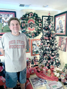 But his favorite belonging — what means more to him than anything else, is the Ohio State wreath that hangs beside his OSU tree. When asked why it holds such sentimental meaning for him, he replied, “My mother made it for me.” He stated she hand-painted each of the signs on the wreath. It is all about family. And, with his family surrounding him and his OSU memorabilia displayed in a way he could never have imagined, Mike Warren truly feels at home. Go Buckeyes!