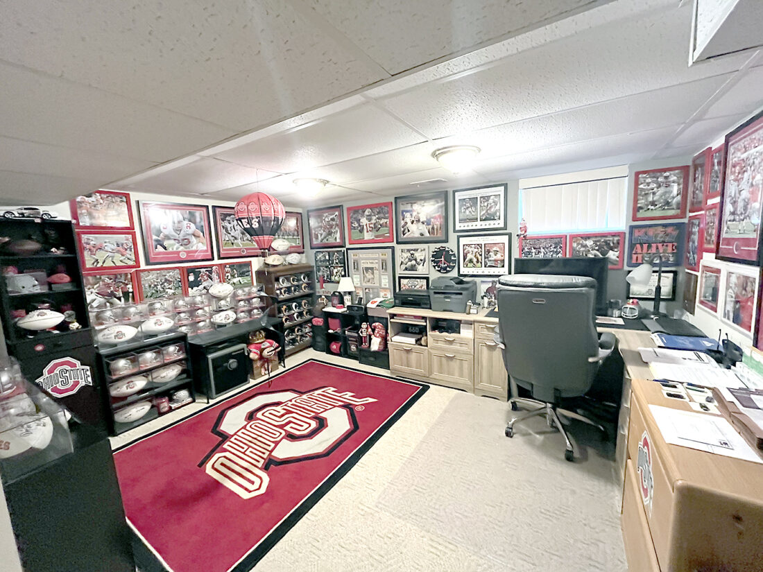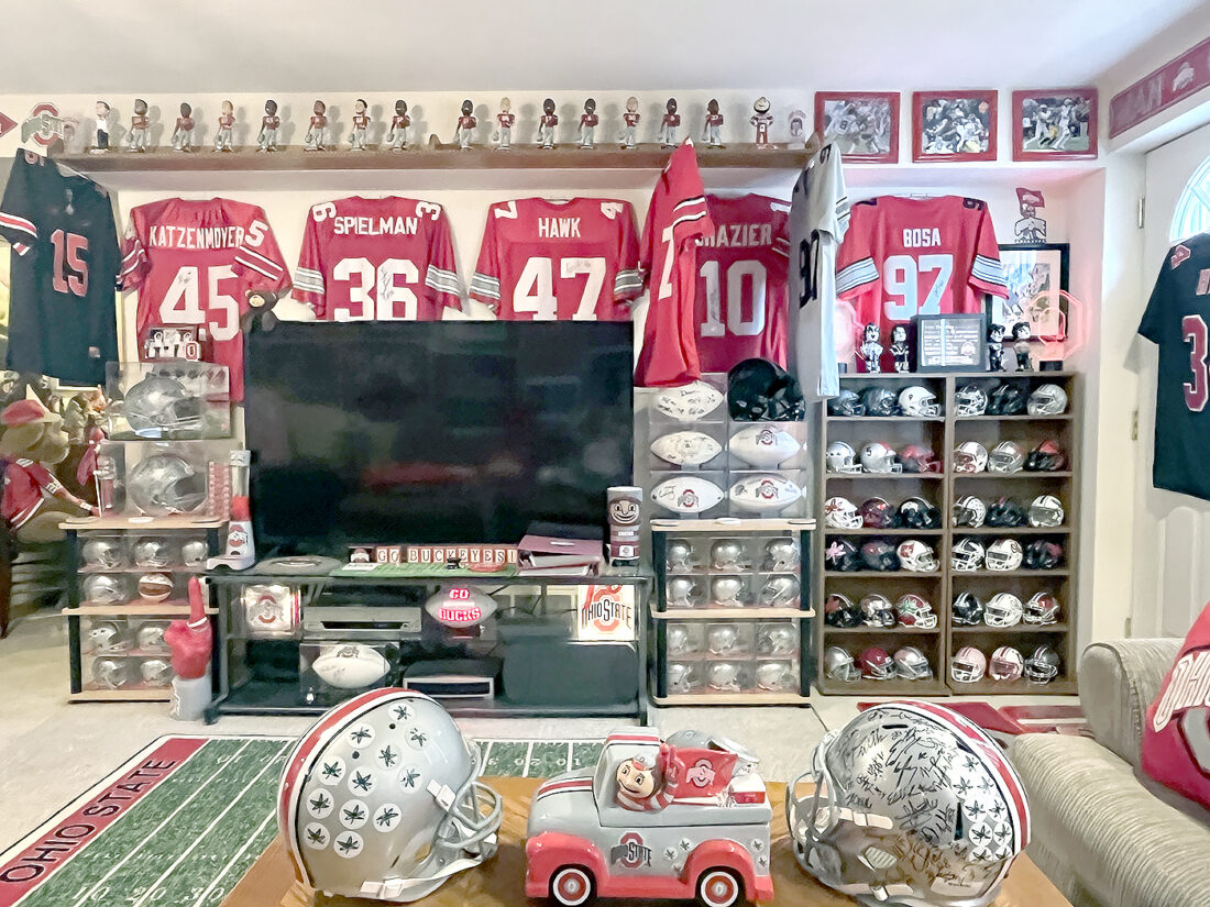 - THE MAN CAVE — The opposite side of the recreation room, otherwise known as the man cave, features numerous signed helmets and many signed jerseys. Among Warren’s favorites, is his first piece of Ohio State merchandise, an Archie Griffin jersey which he had autographed with his late wife, Leslie. — Julie Stenger
