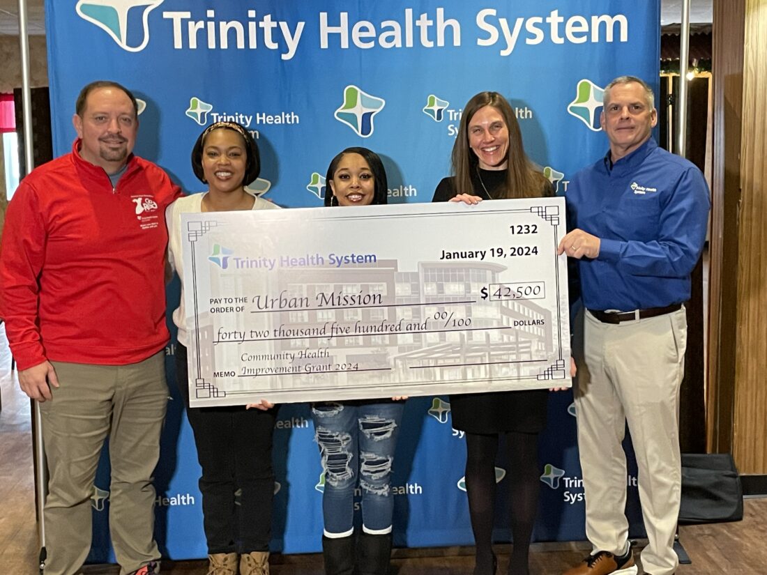 - Julie Stenger GRANTS AWARDED — Recipients of the CommonSpirit Health Community Health Improvement Grants were recognized Friday by officials from Trinity Health System. Honoring the Urban Mission, left photo, were Matt Grimshaw, Trinity’s president and CEO; Cynthia Lytle, community engagement director of the Urban Mission; Awtihana Smith, director of donor engagement of the Urban Mission; Ashley Steele, executive director of the Urban Mission; and Dave Werkin, Trinity’s vice president of finance.