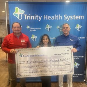 GRANT RECIPIENT — On hand for the presentation to the Ohio Valley Youth Network were, from left, Matt Grimshaw, Trinity's president and CEO; Michelle Clum, programming coordinator for the Ohio Valley Youth Network; and Dave Werkin, Trinity's vice president of finance. -- Julie Stenger